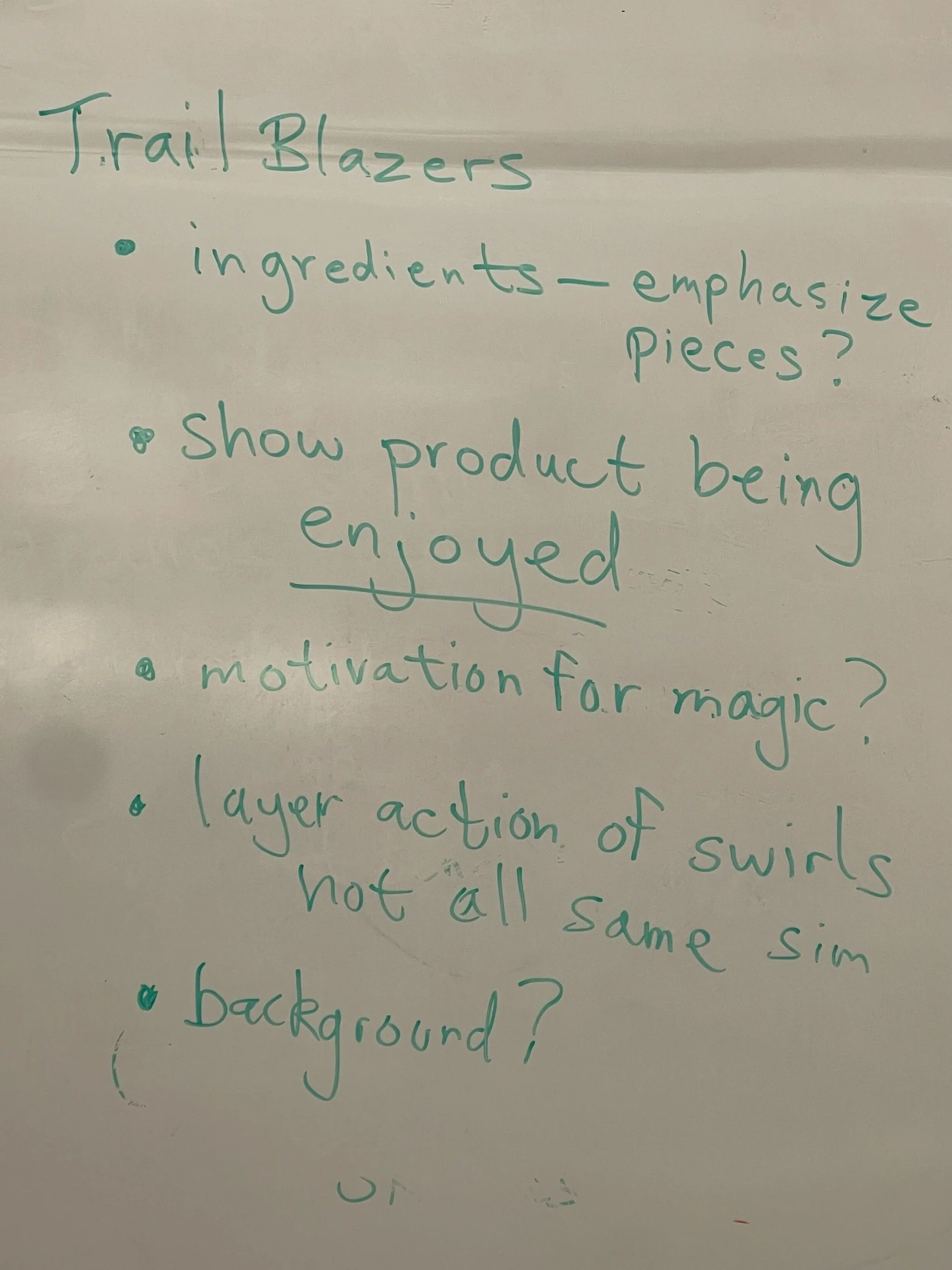 One important piece of feedback was the product being enjoyed, which I think we might have to add another shot for. I would like to do one shot right at the end after the hero shot where the main character is seen floating in space or where the park has melted away except the bench to reveal space, and they are happily chewing away on the trail mix. This would also help drive home our message of “trail mix takes you farther than anything else” by actually bringing the character to space instead of just looking at it.